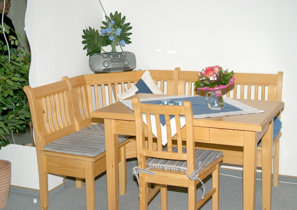 Im Wohnbereich befindet sich eine Essecke mit Bank und Stühlen sowie ein Flachbildfernseher mit Satellitenempfang.