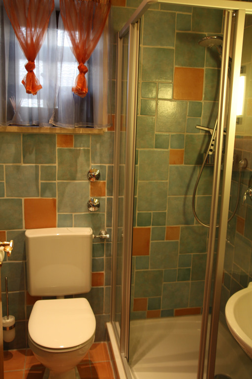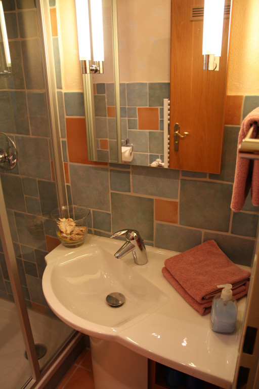 Die Wohnung hat 2 moderne Bäder mit jeweils Dusche, Waschtisch und WC, ein separates Schlafzimmer und eine voll ausgestattete Küche mit E-Herd und Kühlschrank.